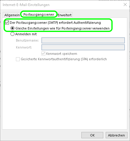 - Haken bei "Der Postausgangsserver (SMTP) [...]" setzen