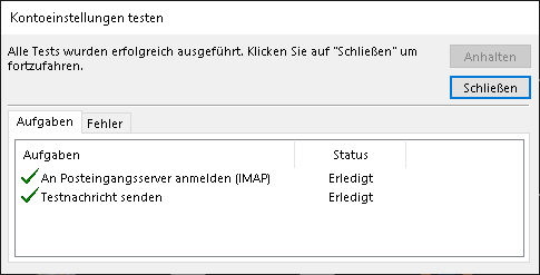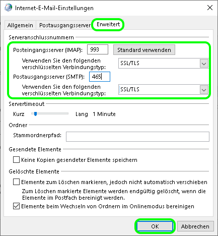 Posteingansserver 993 Verbindungstyp SSL/TLS Postausgangsserver 465 Verbindungstyp SSL/TLS - "OK"