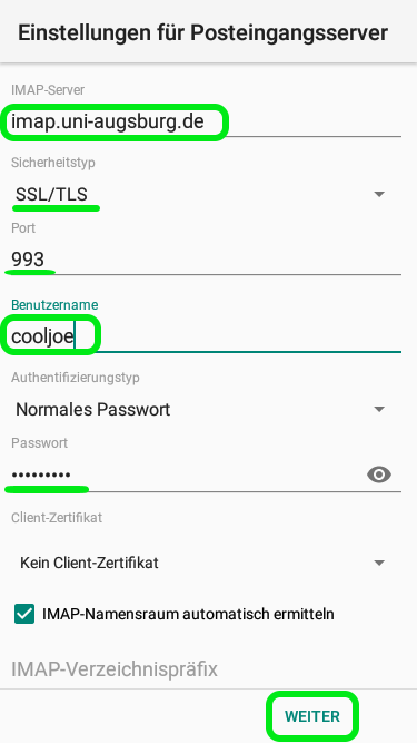 IMAP-Server imap.uni-augsburg.de Sicherheitstyp SSL/TLS Port 993 Benutzername RZ-Benutzerkennung