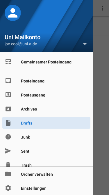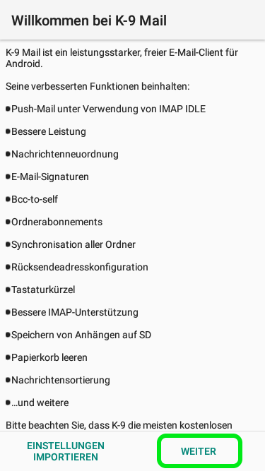 - "K-9 Mail" aus dem PlayStore oder F-Droid Store installieren und starten