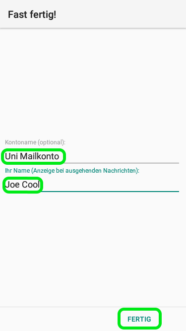 - Kontenbezeichnung und Absender-Name (wird beim Empänger gezeigt) festlegen