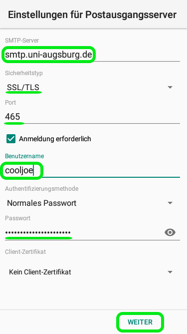 SMTP-Server smtp.uni-augsburg.de Sicherheitstyp SSL/TLS Port 465 Benutzername RZ-Benutzerkennung