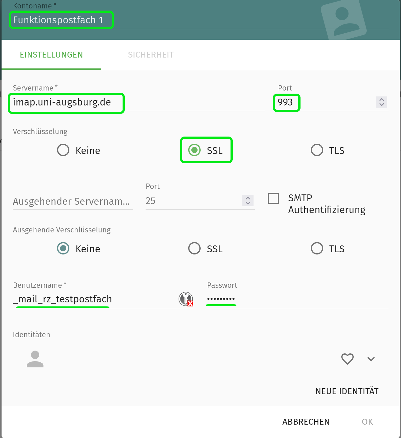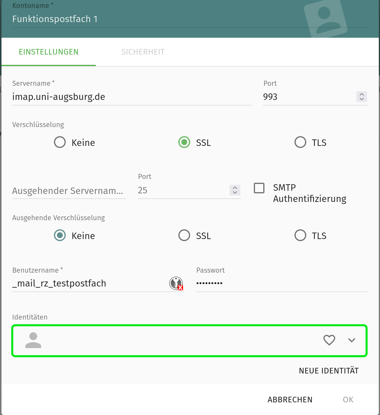 Kontoname Anzeigename des Kontos (Der Name ist nicht nach außen sichtbar) Servername imap.uni-augsburg.de