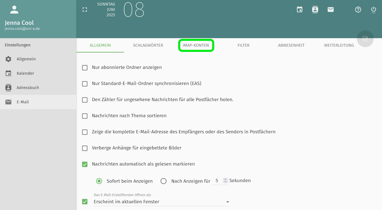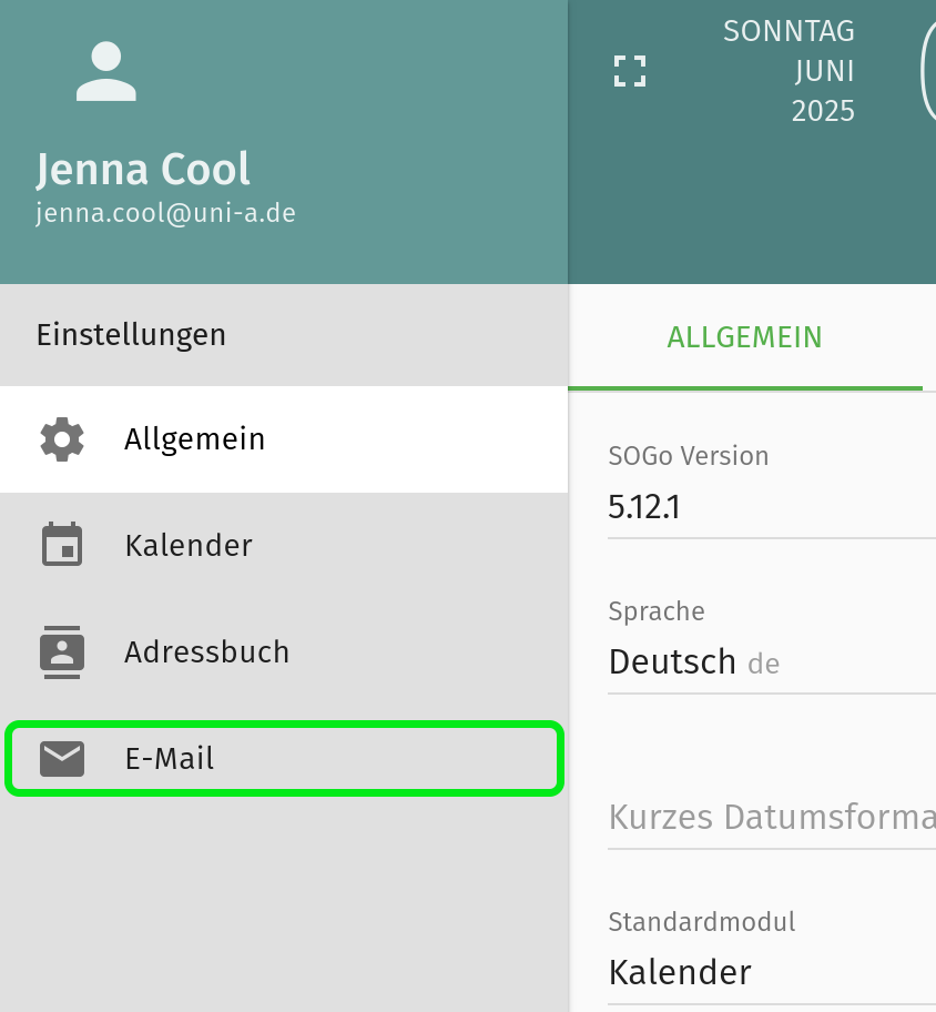 - Den Menüpunkt "E-Mail" in der Seitenleiste wählen