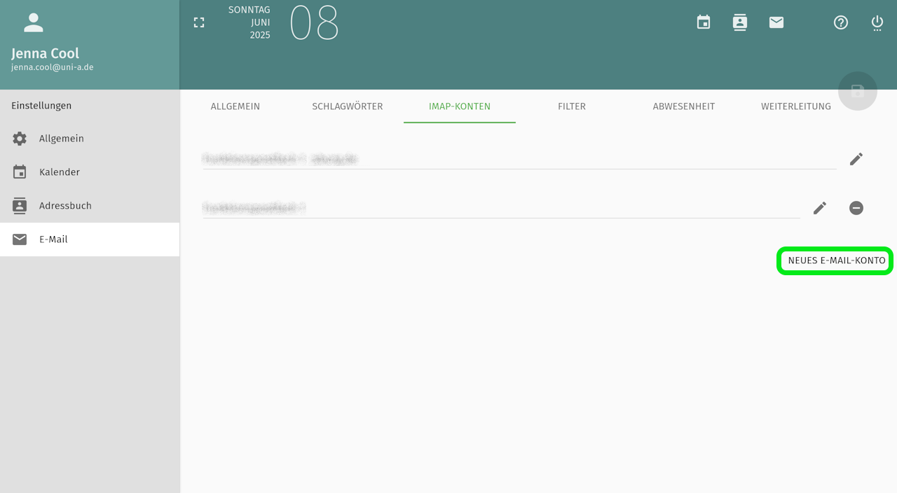 Für die besonders komfortable Nutzung unterstützt unser Webmail die Möglichkeit mehrere Mailkonten ähnlich wie in einem lokalen Mailclient wie Mozilla Thunderbird einzubinden insb. bei der Verwendung der Webapp können so alle von Ihnen benötigten Postfächern im Selben Login genutzt werden. Für die Einrichtung benötigen Sie die lokale Postfach-Kennung und das Passwort, dies können Sie z.B. bei Ihrem Vorgesetzten oder Ihrer DV-Betreuung anfragen.