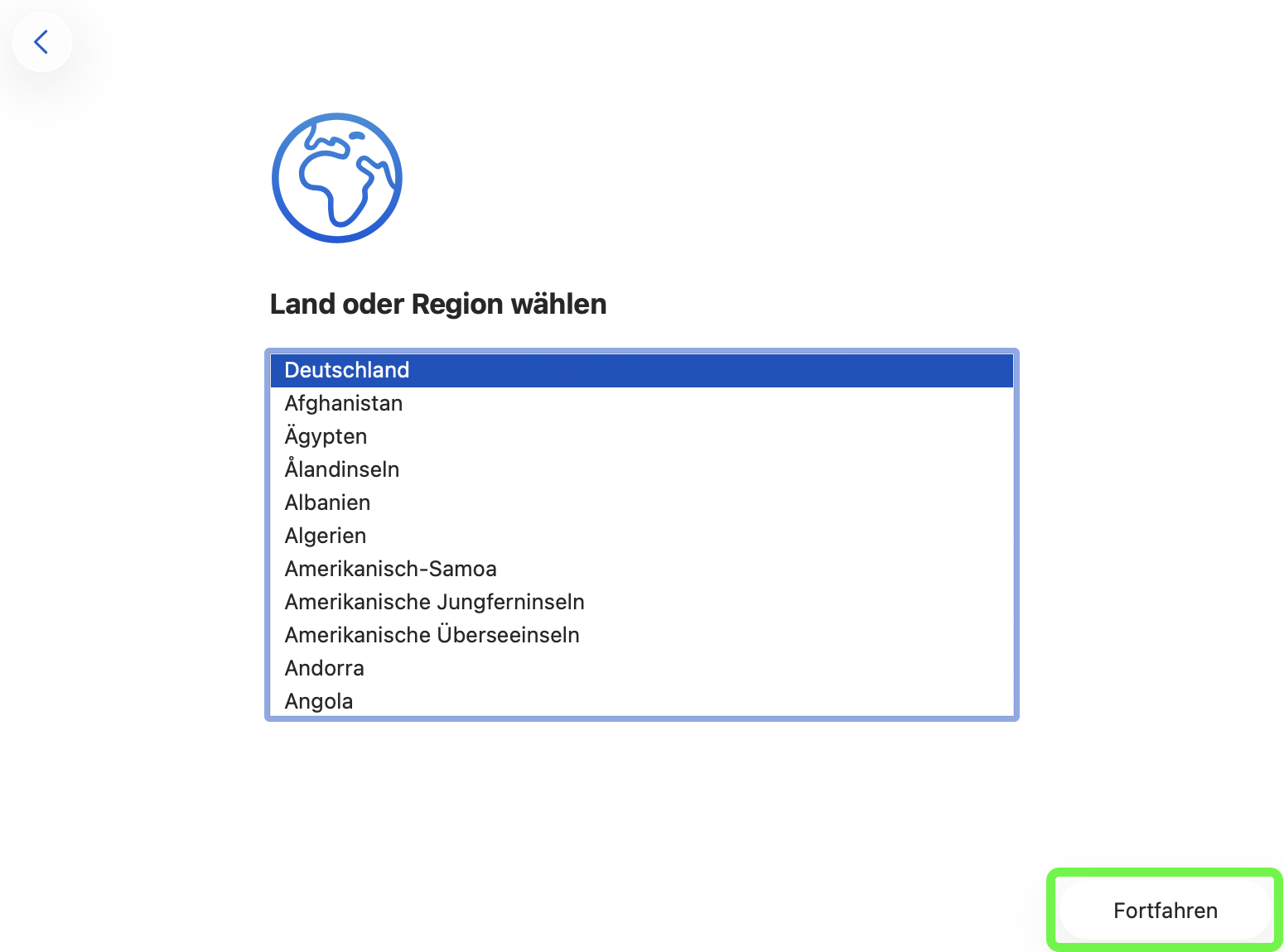 - Region & Sprache auswählen und mit "Fortfahren" bestätigen