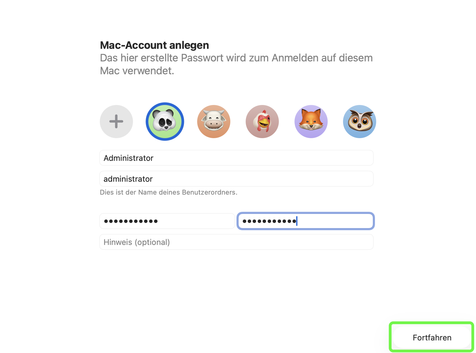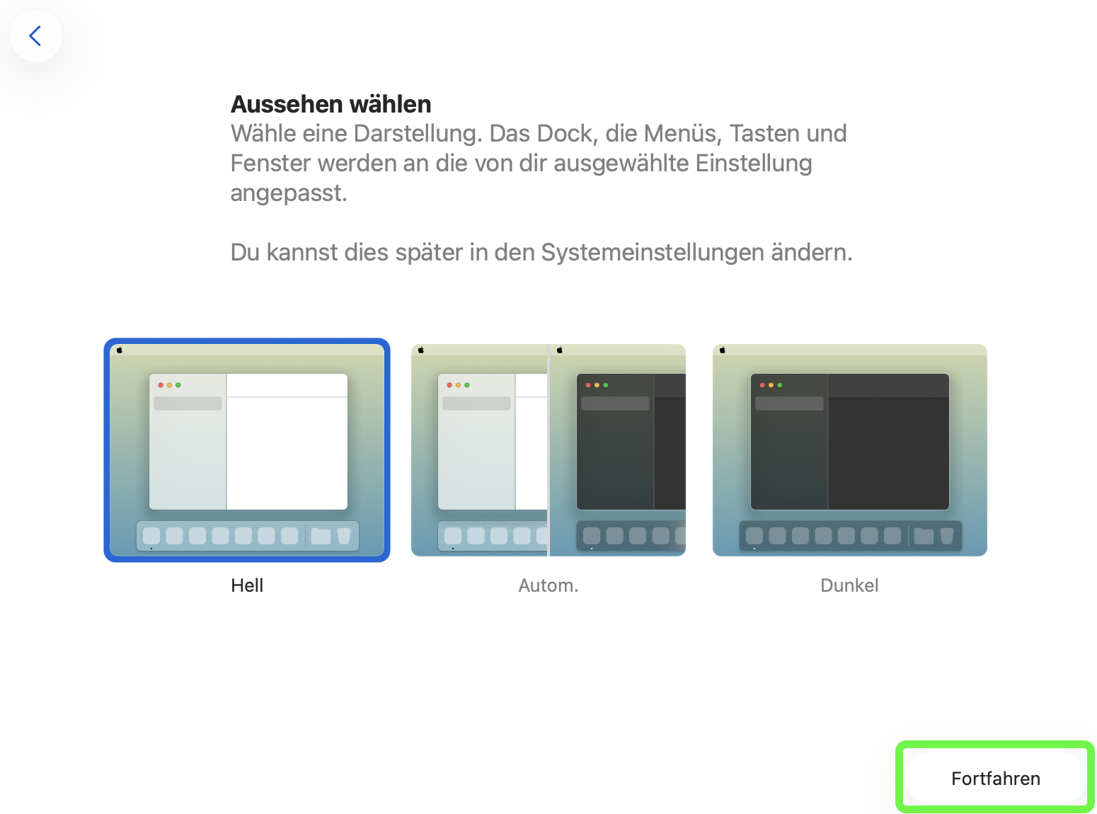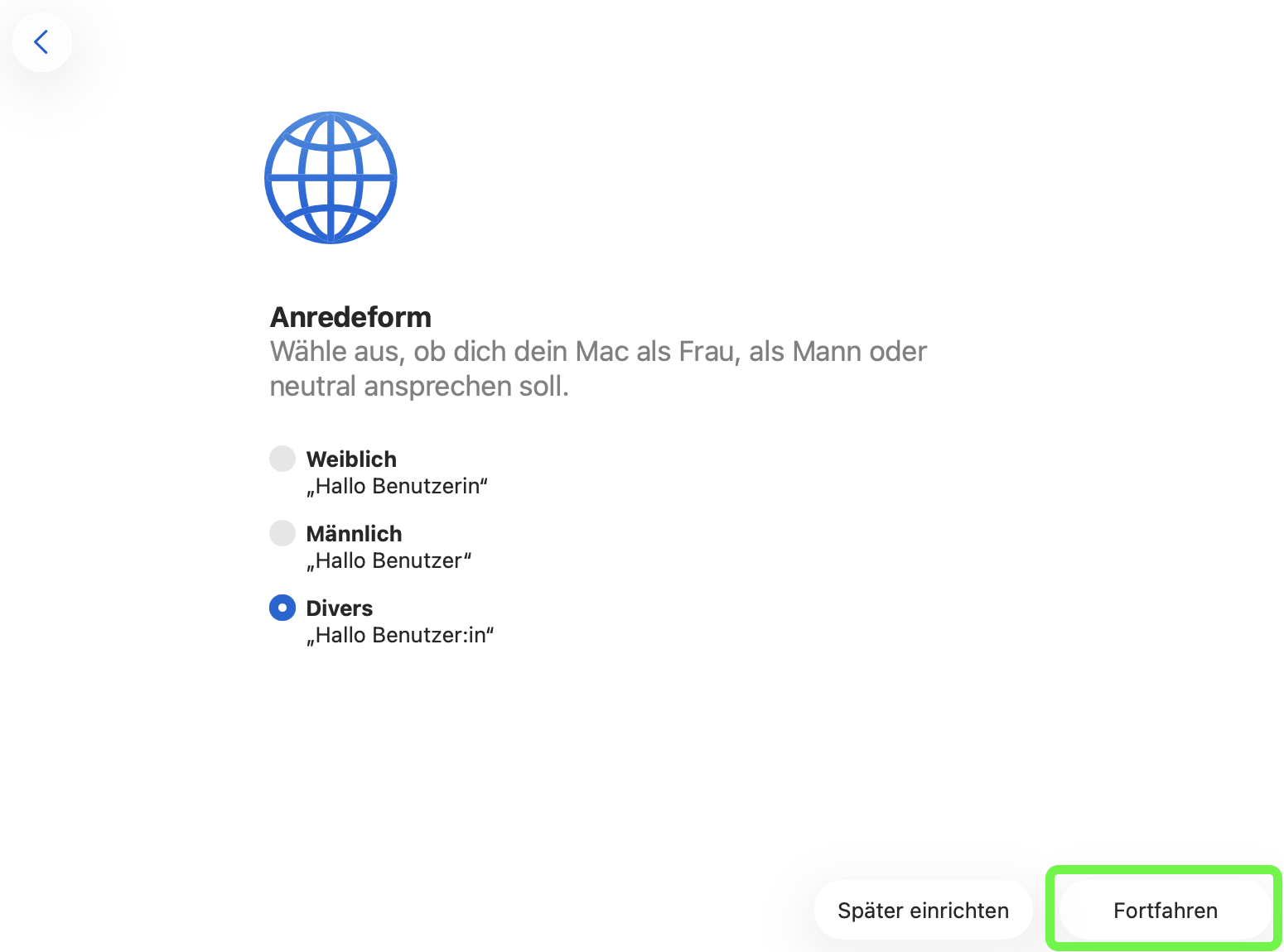 → Bei älteren macOS Versionen vor Tahoe erscheint dieser Dialog erst im späteren Verlauf - Die gewünschte Anredeform auswählen und "Fortfahren"