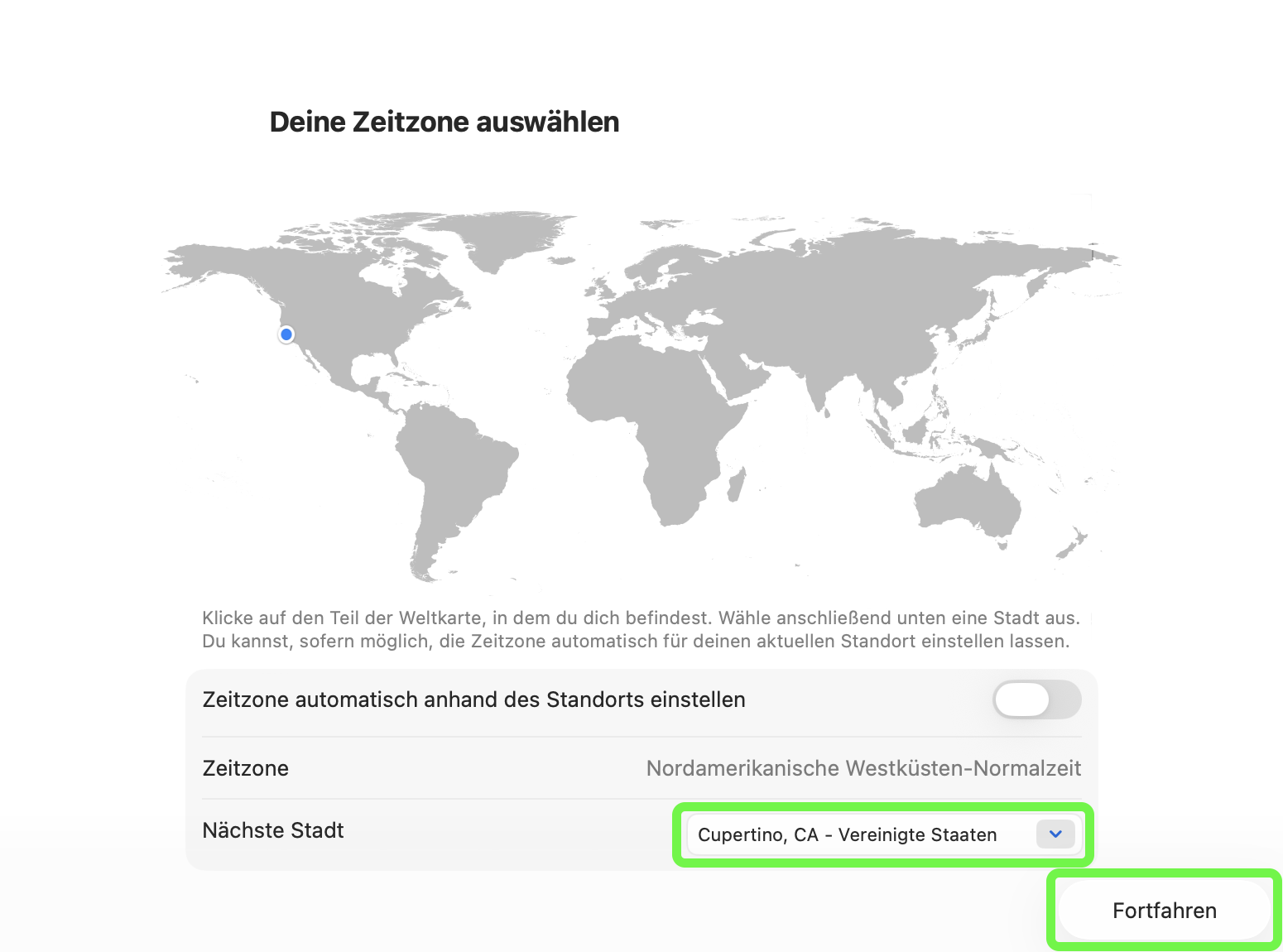 - Die Zeitzone aus der Liste oder Klick auf die Kartenposition festlegen & "Fortfahren"