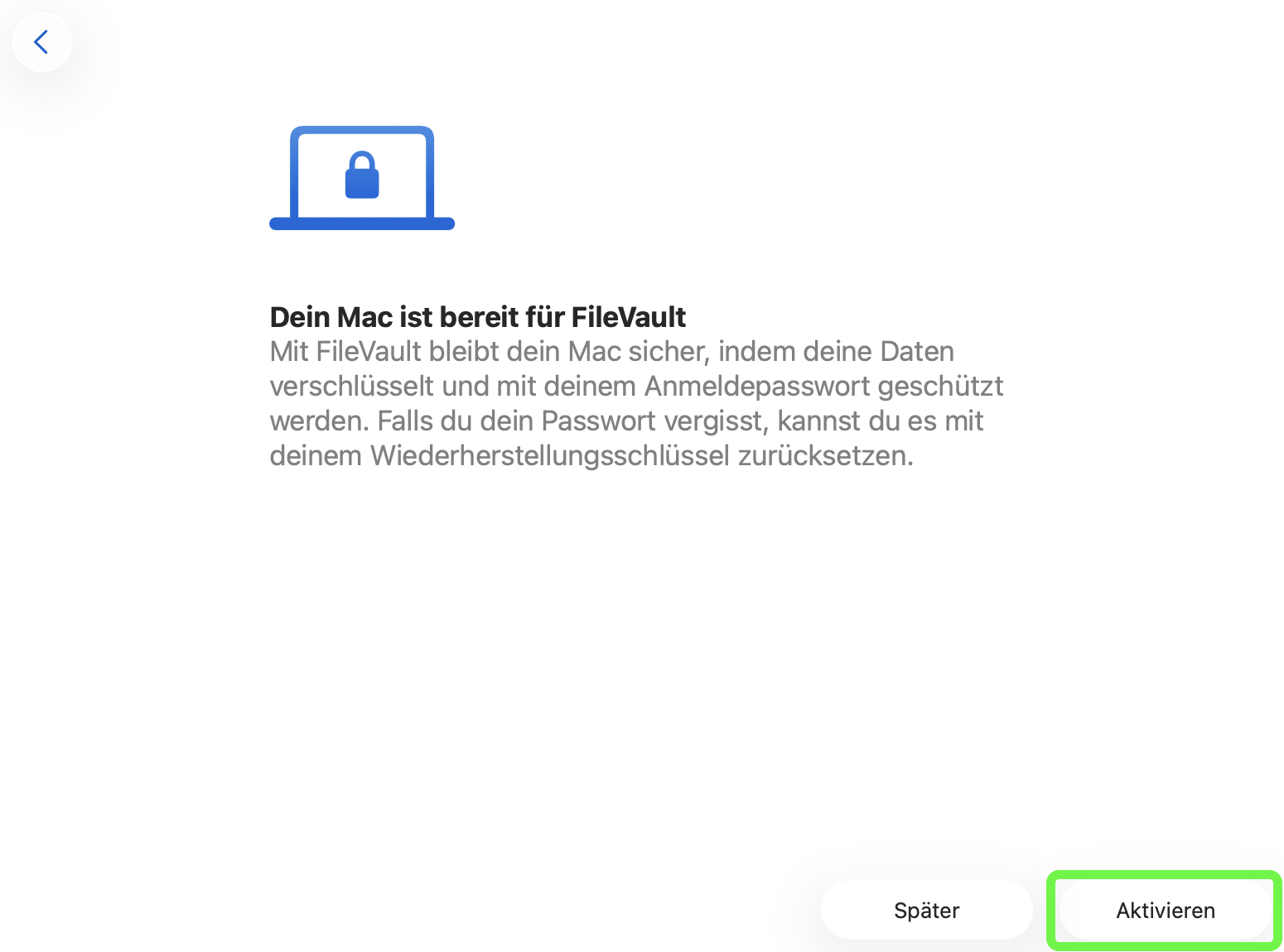 - Wir empfehlen grundsätzlich die Festplatten-Verschlüsselung (FileVault) zu aktivieren