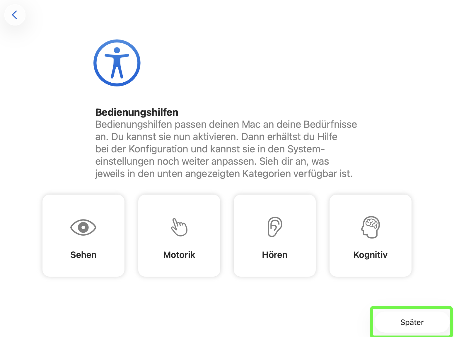 - Den Beschreibungsdialog für die Bedienungshilfen über "Später" überspringen