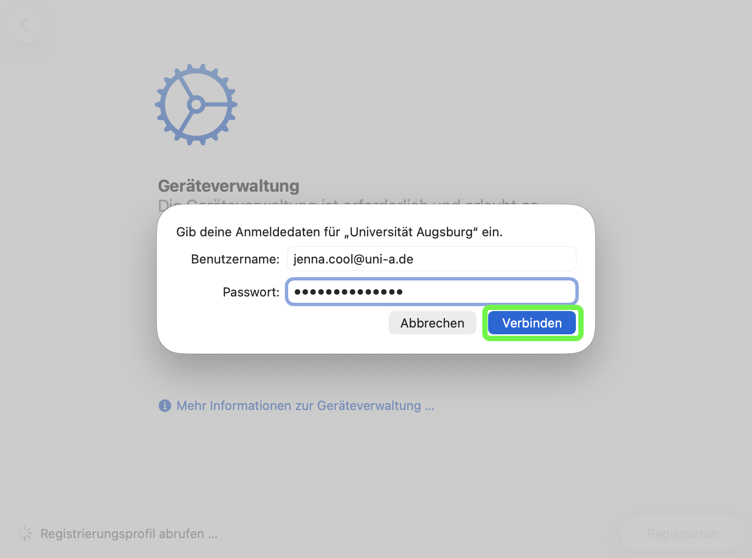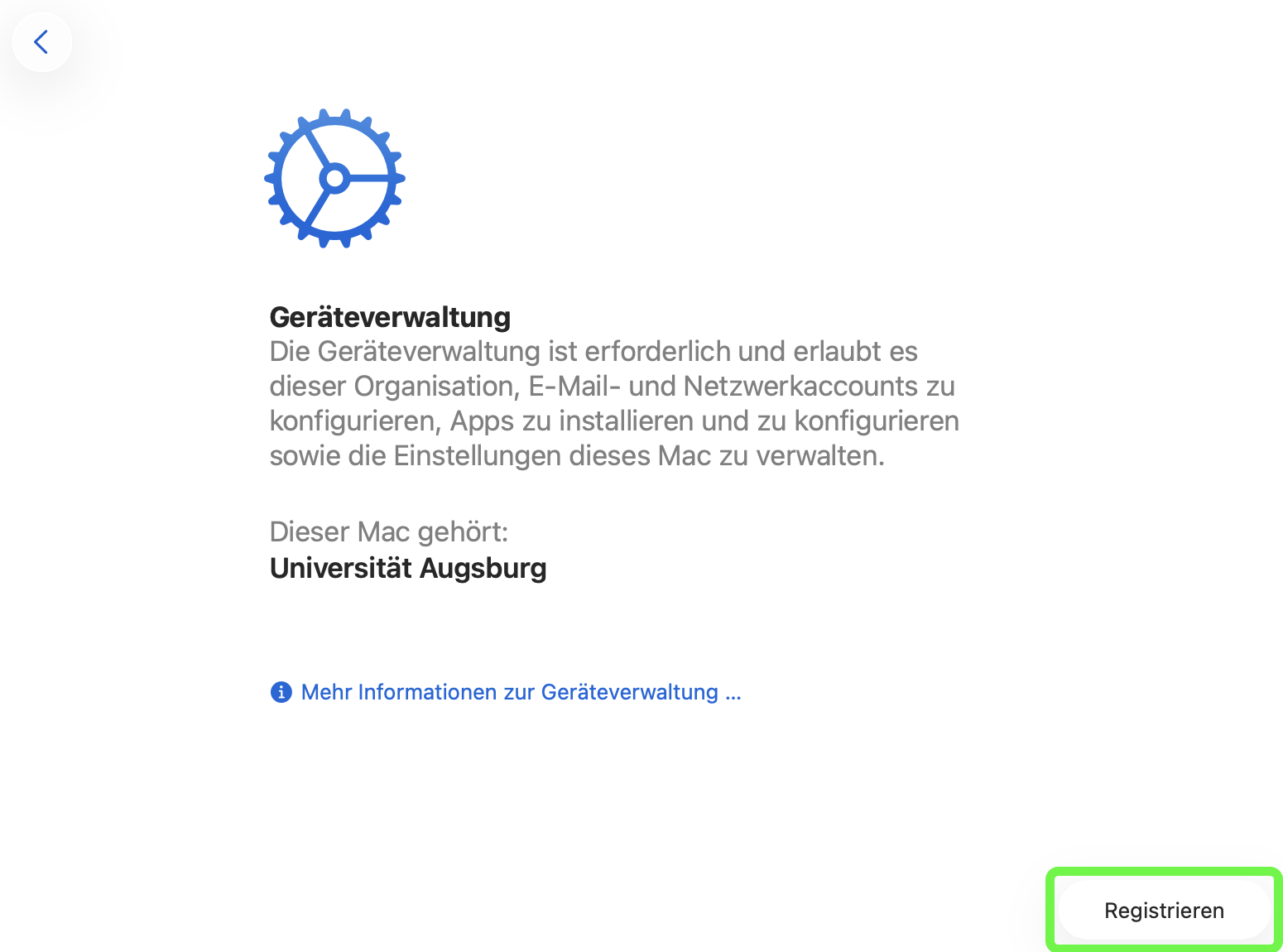 Alle macOS Geräte, die über die Rahmenvertragspartner der Universität Augsburg beschafft wurden, sind gegenüber Apple als der Universität zugehörig registriert. Dies ermöglicht die Aktivierung der Geräte ohne Apple-ID und bildet die Grundlage für eine Verwaltung und Administration der Geräte. Die Geräte erhalten automatisch eine Basiskonfiguration an Sicherheits- & Privatsphäreneinstellungen sowie die Apps für universitäre Dienste wie eduVPN und Microsoft Office sowie die Konfiguration für eduroam. Die Konfiguration wird automatisch allen erstmalig aktivierten Geräten zugeordnet, sowie Geräten die auf Werkseinstellungen zurückgesetzt wurden.