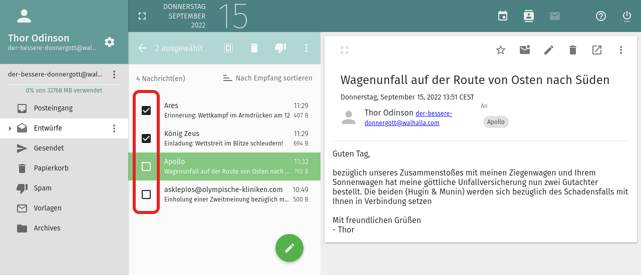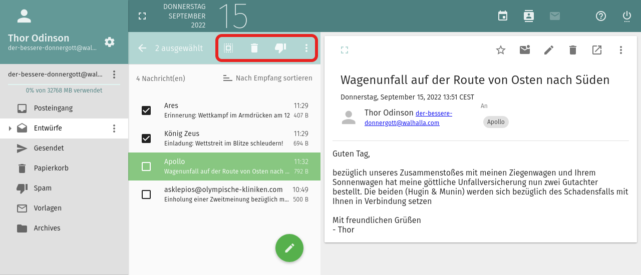 Um z.B. mehrere E-Mails gleichzeitig zu löschen, in einen anderen Ordner zu verschieben, als Spam zu markieren etc., gibt es die Möglichkeit, diese durch eine Mehrfachauswahl zu markieren. Eine Mehrfachauswahl kann wie folgt vorgenommen werden