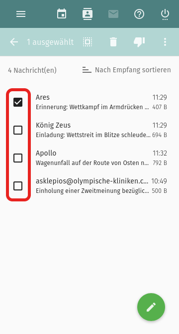 - Sobald das Kästchen aktiviert ist, erhalten automatisch alle Mails in der Liste ein Kontrollkästchen anstelle des Avatars