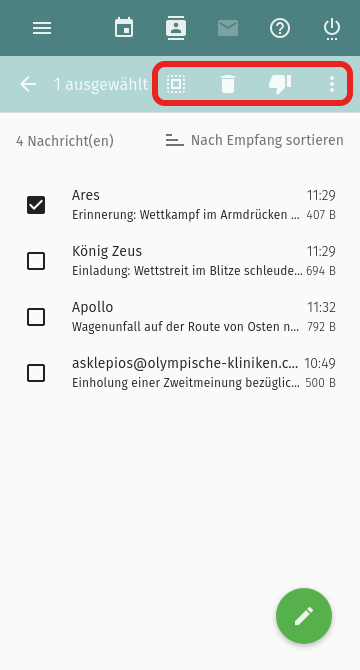 wie "alles markieren" oder "markierte Mails in den Spam-Ordner" zur Verfügung - Über das "Drei-Punkt-Menü" können weitere Funktionen wie kopieren, verschieben etc. aufgerufen werden