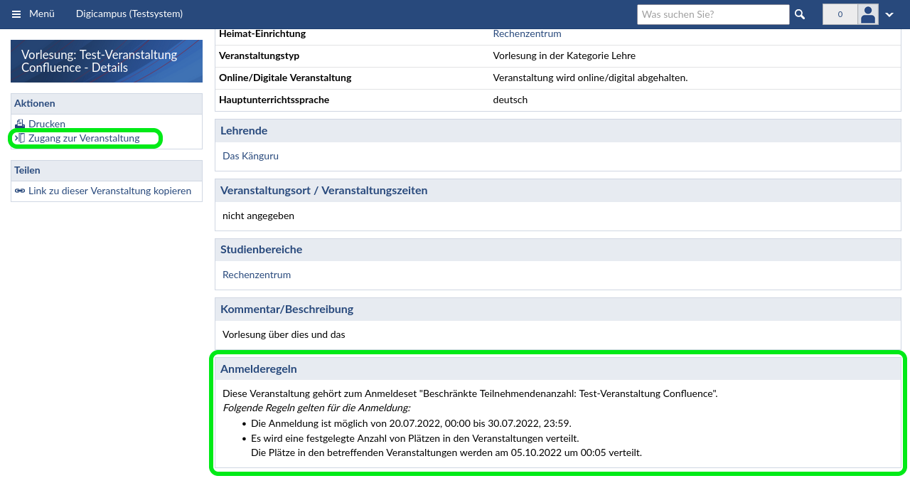 - Die Einschränkungen einer Veranstaltungen sind auf der Übersicht im Kasten "Anmelderegeln" genau verzeichnet: