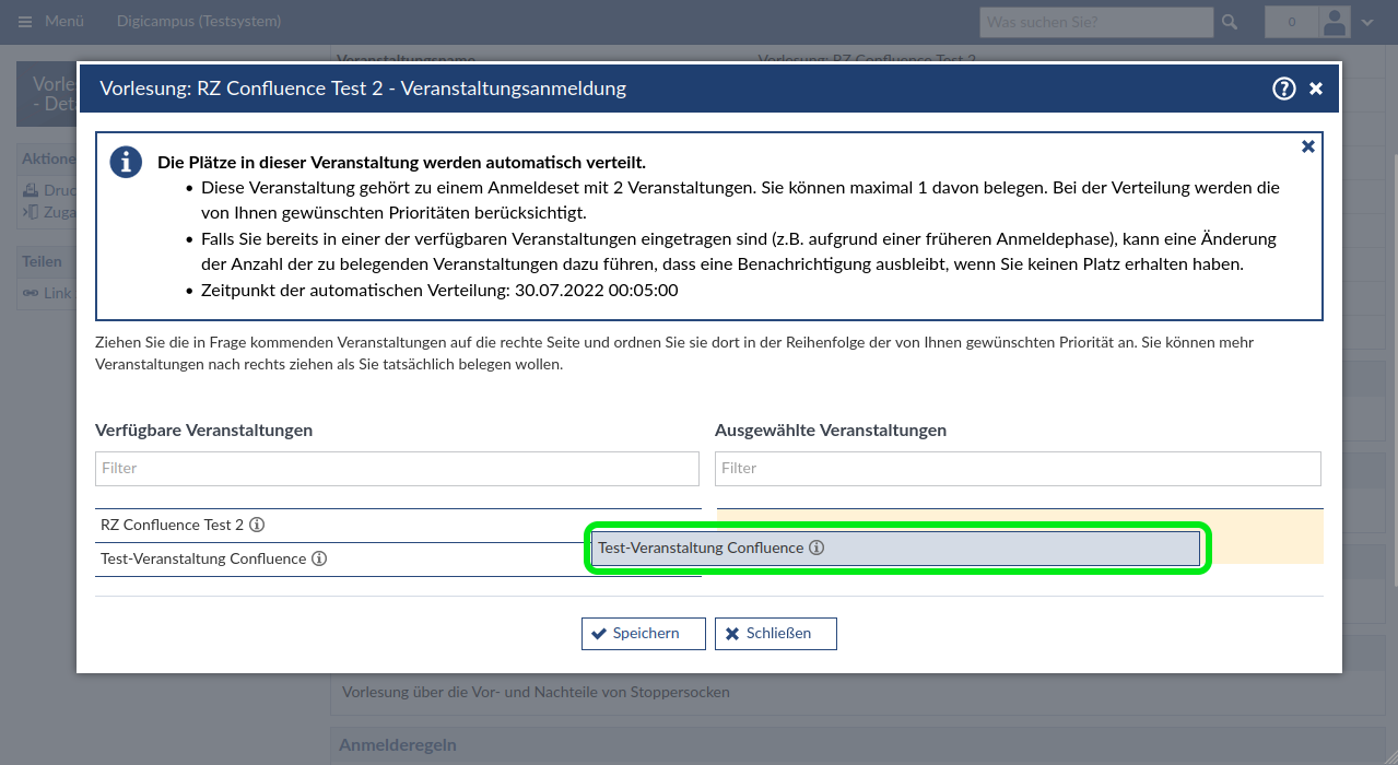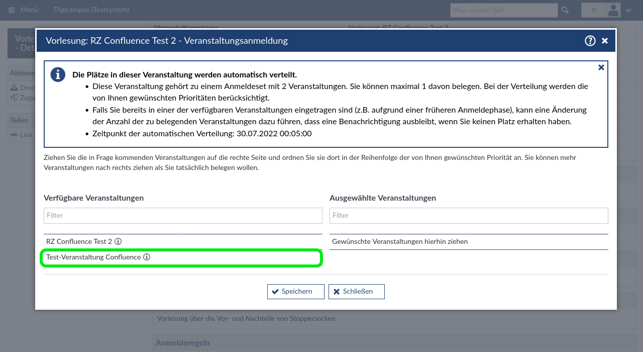 - Über "Drag'n Drop" können dann die verfügbaren Veranstaltungen angeklickt und nach rechts in die Auswahl gezogen werden