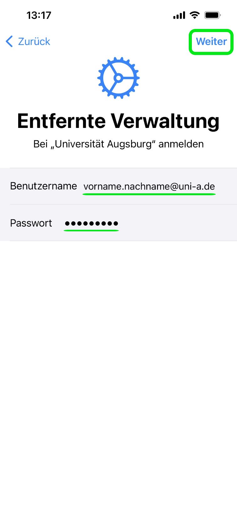 Benutzername: "@uni-a.de"-Adresse (i.d.R. vorname.nachname@uni-a.de)