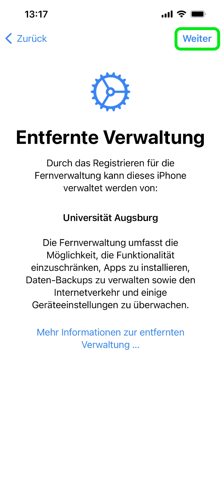 - Den Hinweis zur Verwaltung mit "Weiter" bestätigen