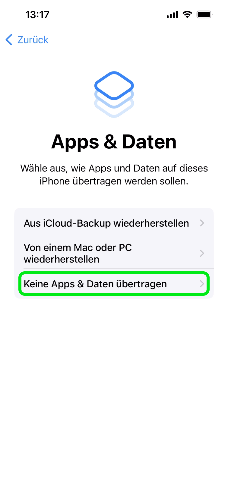 - Optional: Wiederherstellung aus einem bestehenden Backup, andernfalls "Keine Apps & Daten übertragen" wählen