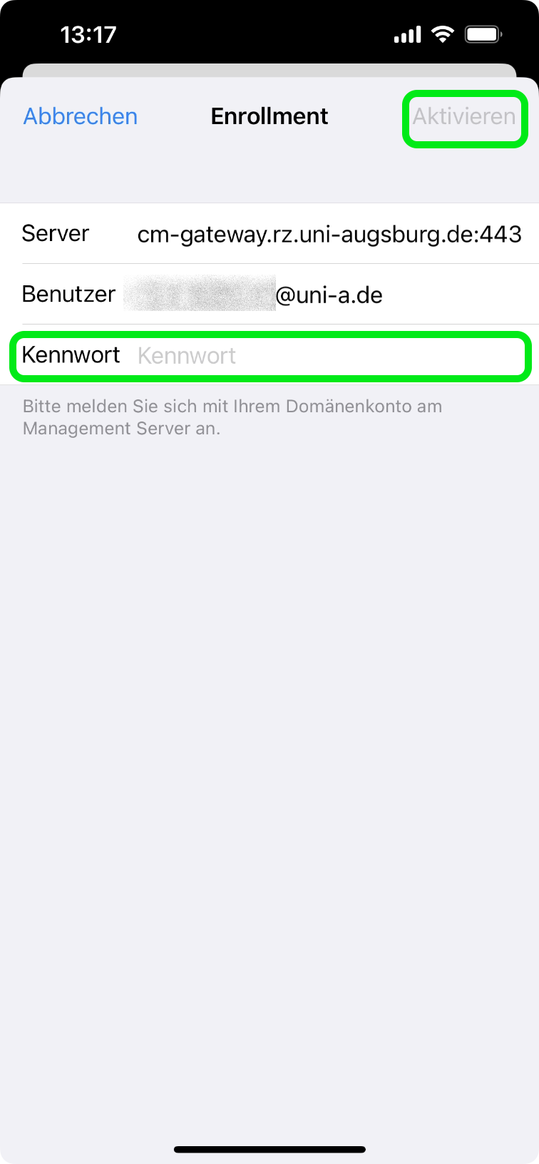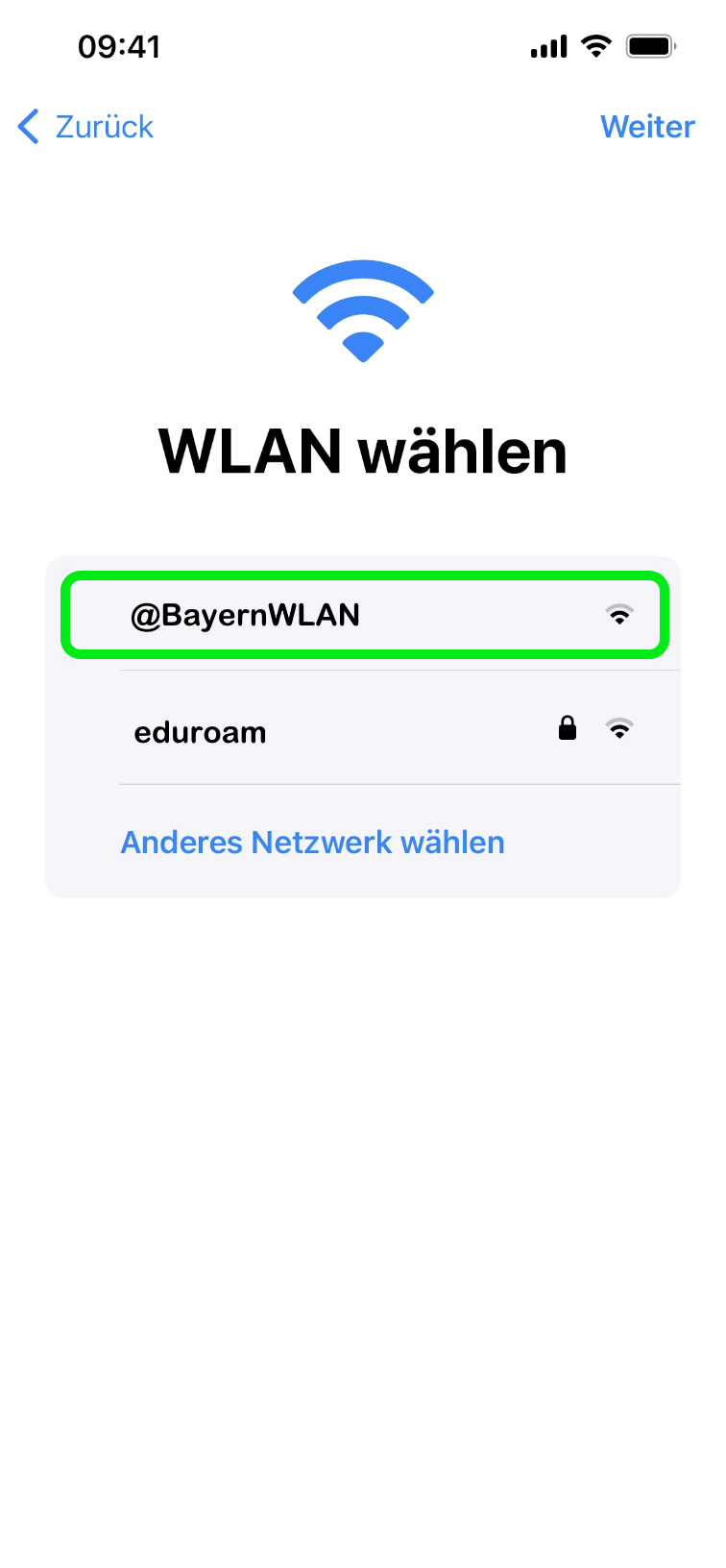 Für die Aktivierung ist eine Netzwerkverbindung mit einem passwortgeschützten WPA2/3 oder öffentlichen WLAN erforderlich. Am Campus eignet sich dazu das @BayernWLAN, zuhause funktioniert in den meisten Fällen aber auch Ihr privates WLAN.