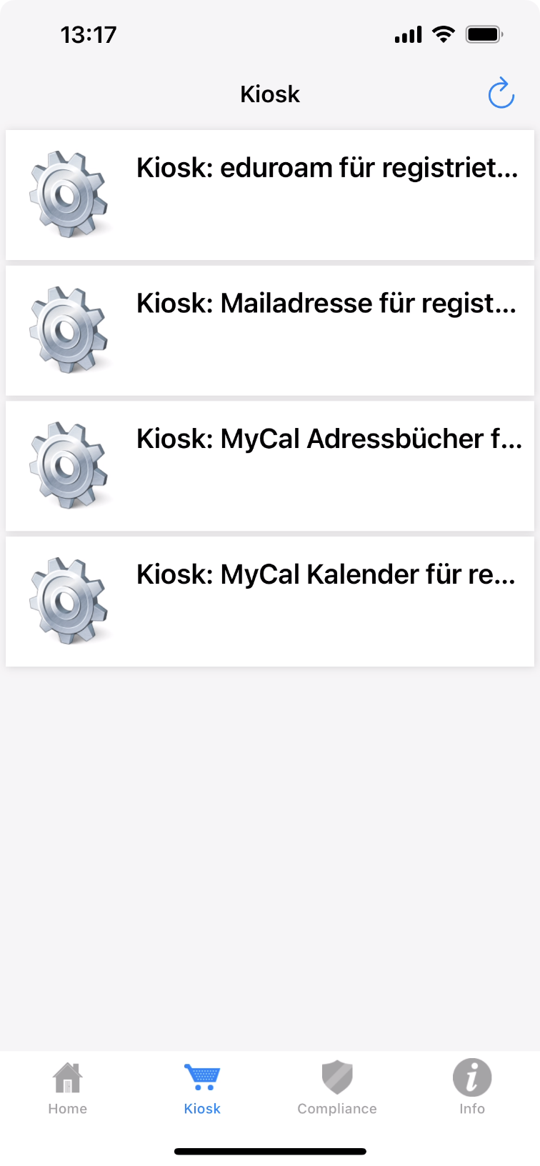 Darüber hinaus werden über einen "Kiosk" einige praktische Aktionen wie das Einrichten von eduroam, der universitären Mailadresse sowie Kalender & Adressbüchern (Webmail/MyCal) optional für den als Besitzer hinterlegten Nutzer angeboten.