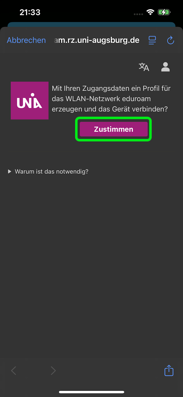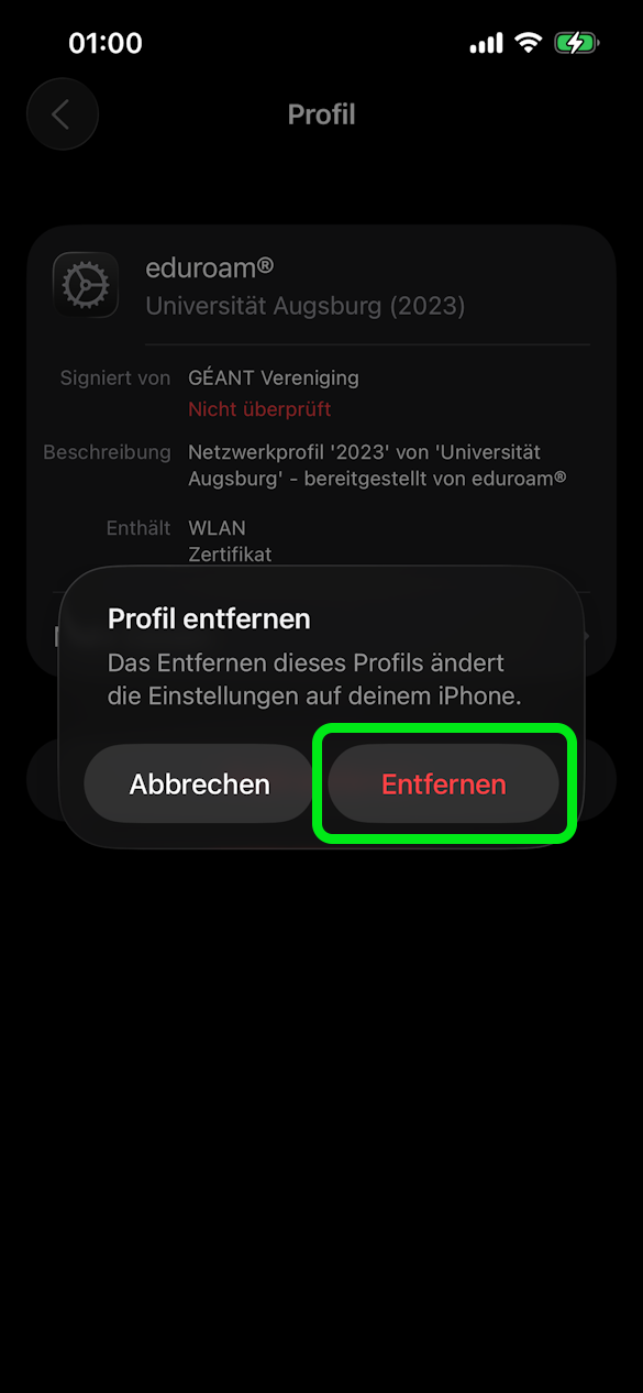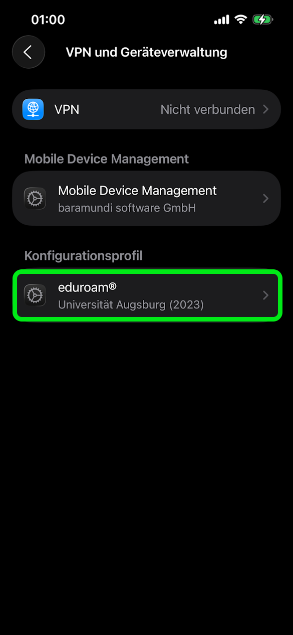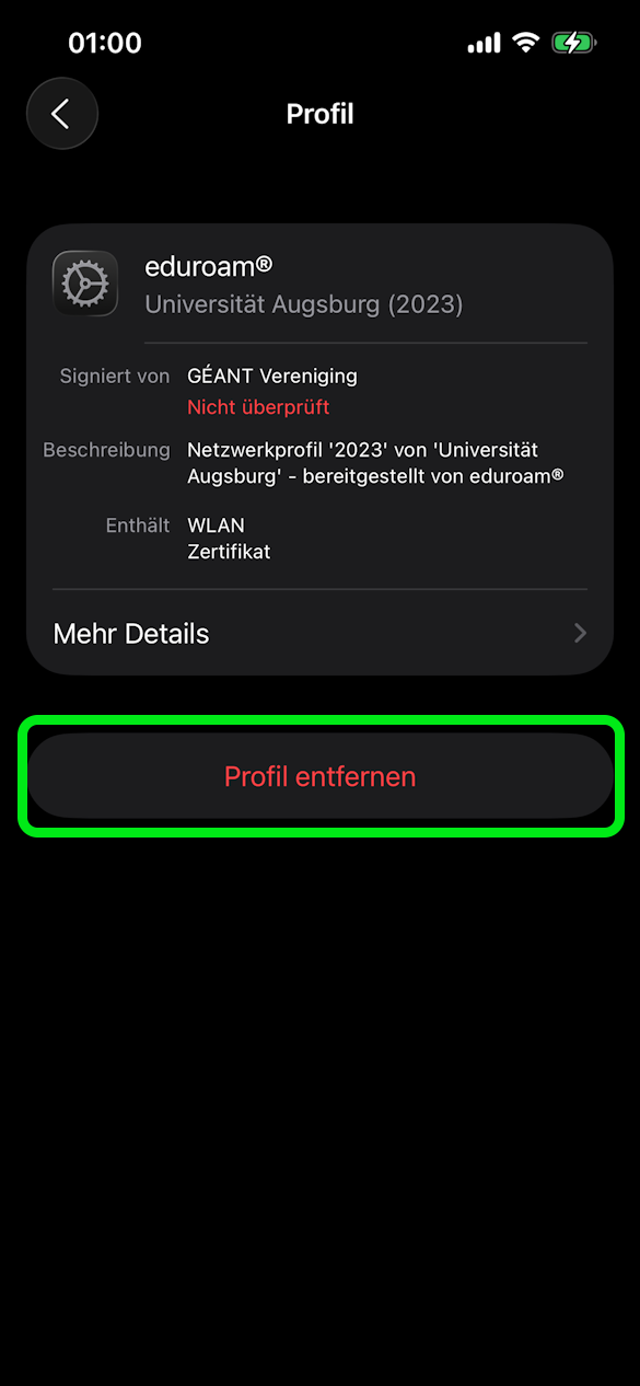 Ist bereits ein Profil für eduroam installiert z.B. von unserer alten Infrastruktur oder einer anderen Bildungs- oder Forschungseinrichtung, muss dies zunächst in den Einstellungen entfernt werden.