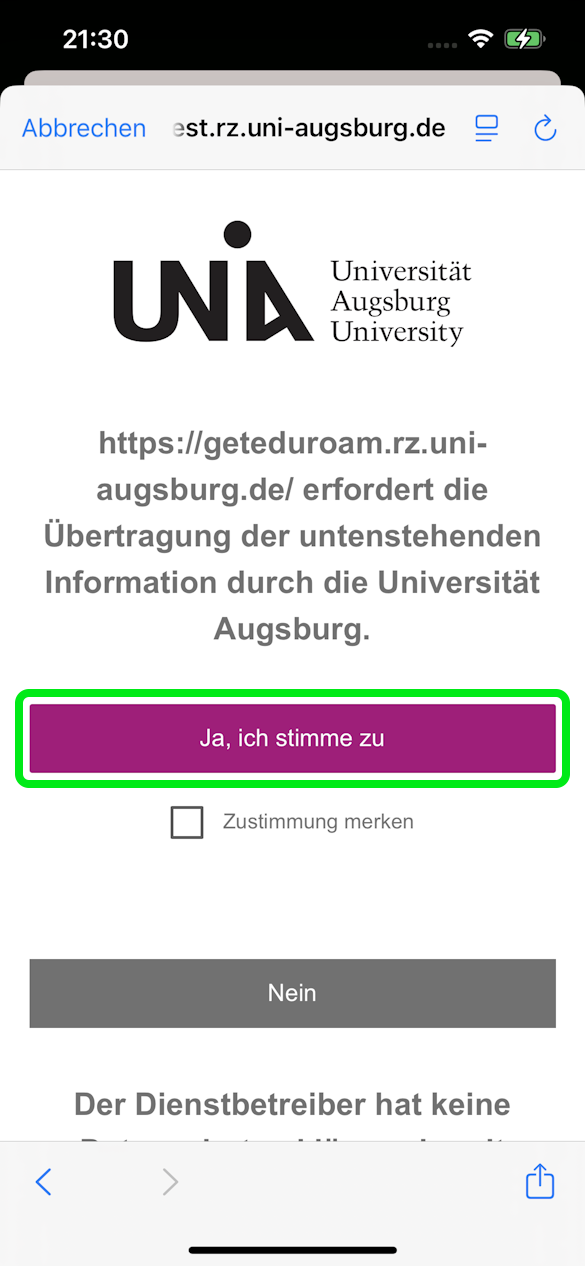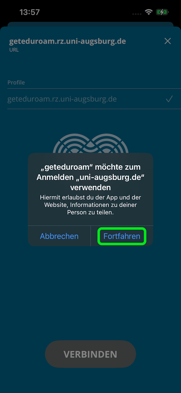 → Bei Problemen mit der Suche kann auch direkt unsere Serveradresse: https://geteduroam.rz.uni-augsburg.de eingetragen werden - "Fortfahren"