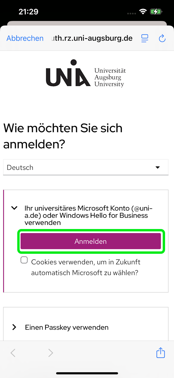 - Wahlweise mit dem universitären Microsoft Account, Passkey oder mit RZ-Kennung und zweitem Faktor anmelden