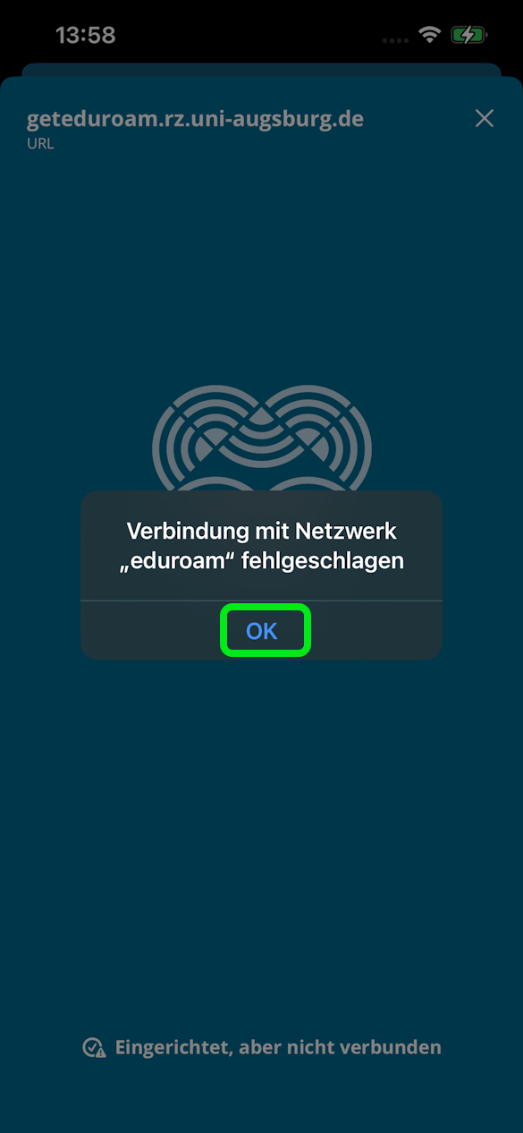 - Befinden Sie sich nicht in Reichweite eines eduroam Access Points erhalten Sie ggf. eine Fehlermeldung, diese einfach mit "OK" bestätigen.