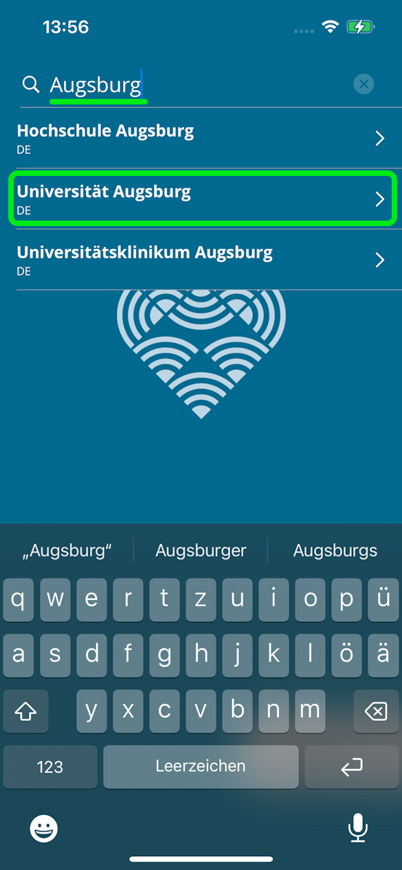 - Über das Suchfeld nach "Augsburg" suchen und "Universität Augsburg" wählen
