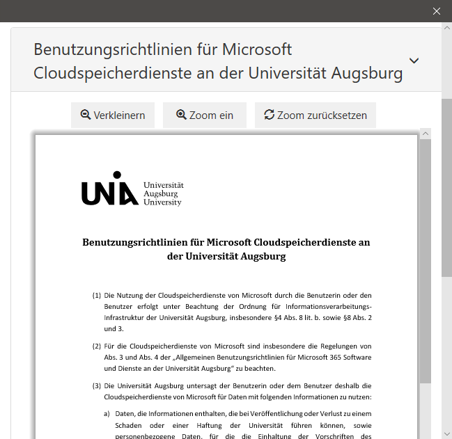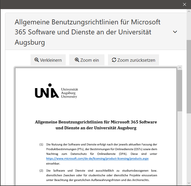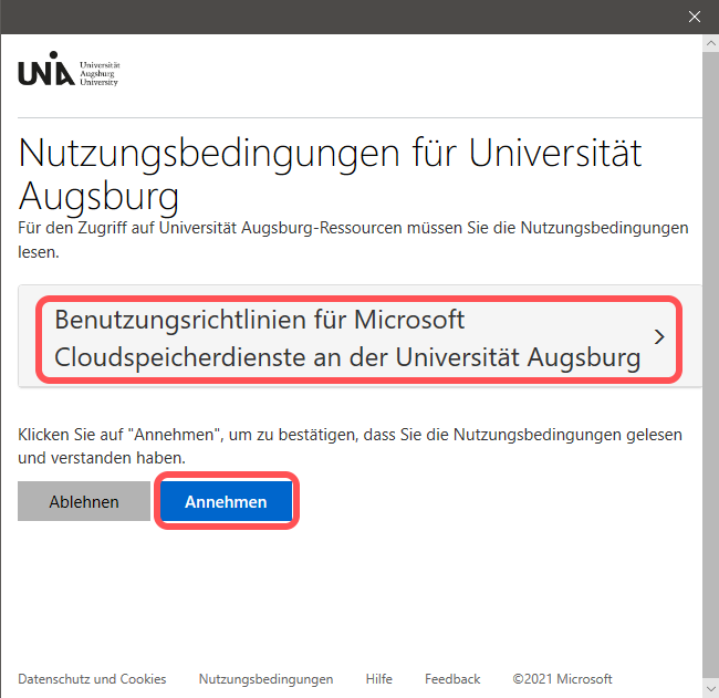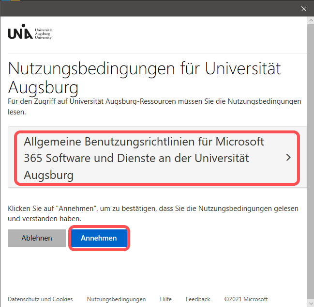 Den Nutzungsbedingungen für die Bentzung von Microsoft 365 an der Universität Augsburg zustimmen.