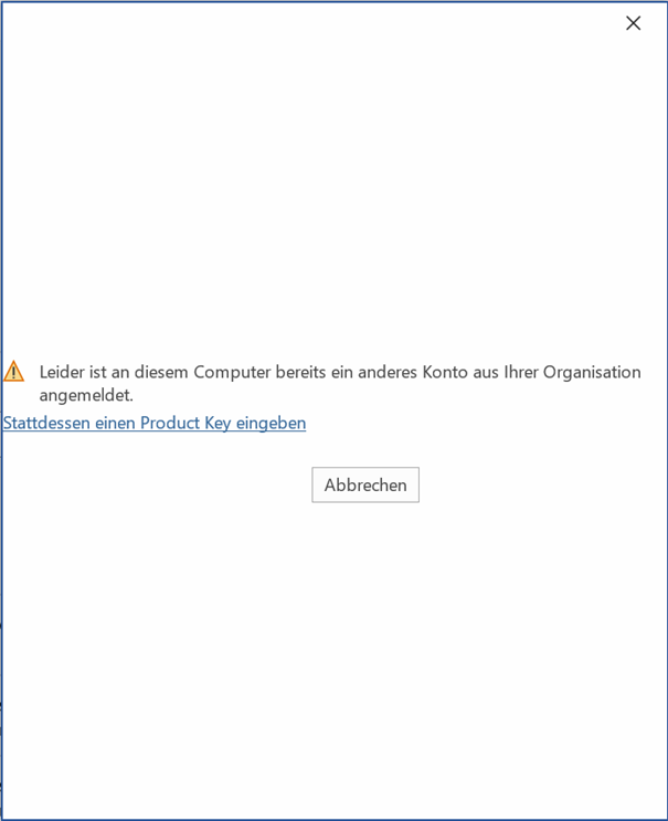 - Unter der Meldung "Leider ist an diesem Computer bereits ein anderes Konto aus Ihrer Organisation angemeldet" auf Abbrechen klicken.