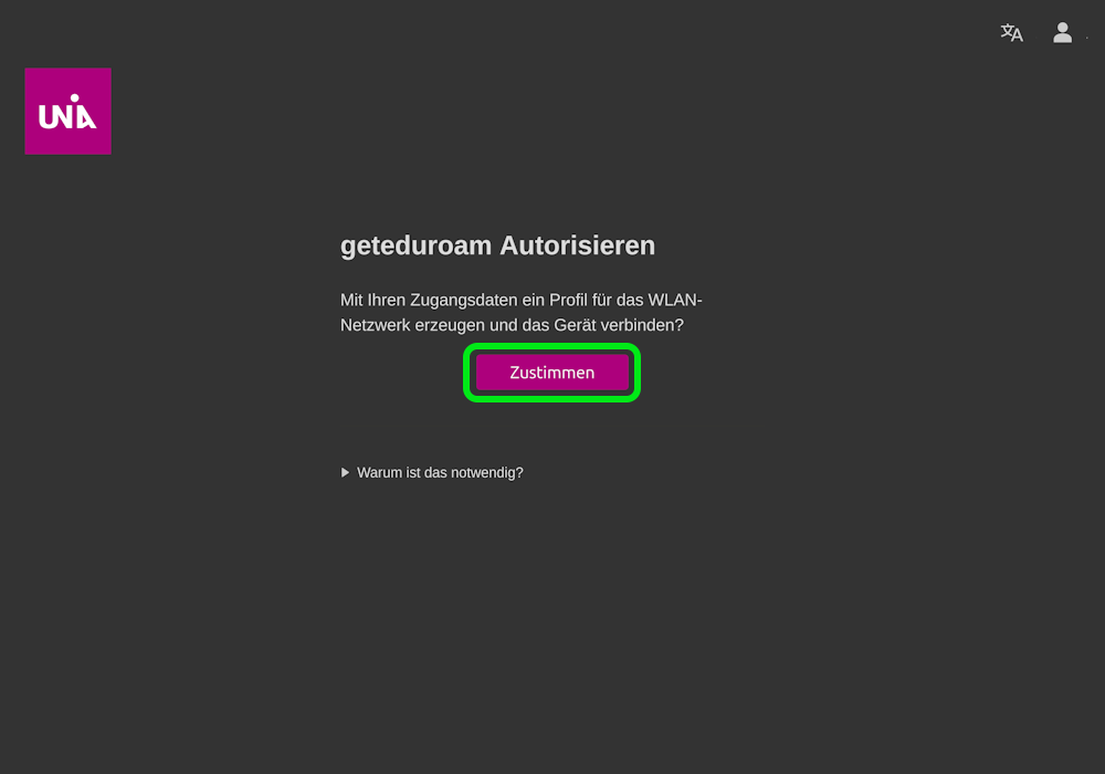 - Der Datenübermittlung an das eduroam Portal mit "Ja ich stimme zu" zustimmen