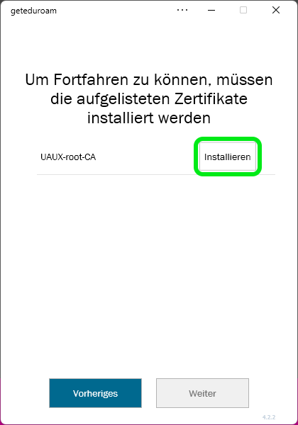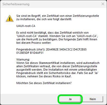 - Bei der erstmaligen Einrichtung muss ggf. noch unser Wurzelzertifikat installiert werden