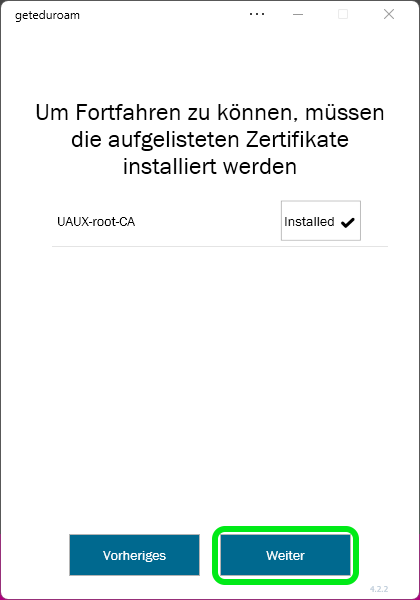 → Die Gültigkeit kann jederzeit durch erneutes starten der Anwendung verlängert werden - Die Einrichtung von eduroam ist abgeschlossen und kann genutzt werden