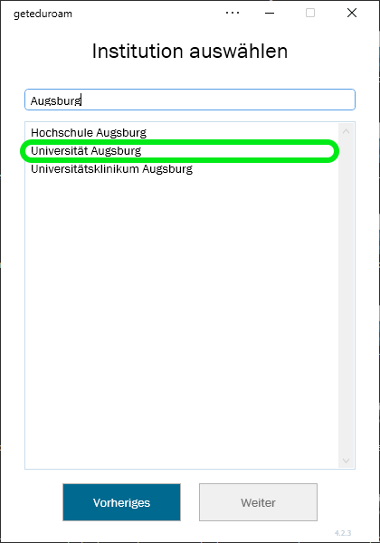 - Über die Suchleiste nach 'Augsburg' suchen, anschließend "Universität Augsburg" per Doppelklick auswählen