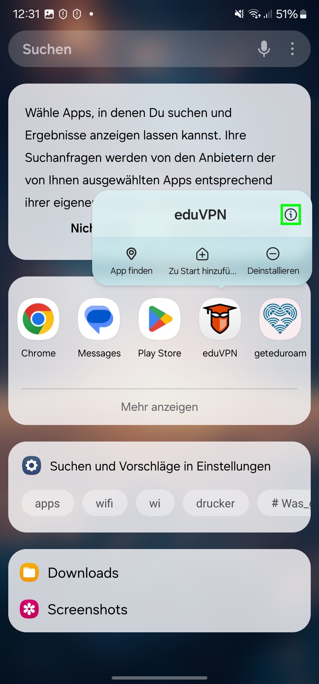 In der App-Übersicht die eduVPN-App lange gedrückt halten, bis das auf dem Screenshot zu sehende Menü erscheint. Oben Rechts auf das Ausrufezeichen tippen und die App-Info-Ansicht öffnen