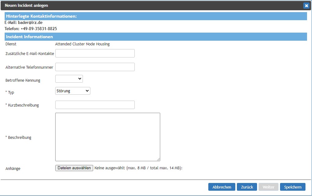 Operational issues can be reported by opening an incident ticket at LRZ servicedesk. After logging in, a form will open. Fill in all required information. Please provide as many details as possible: