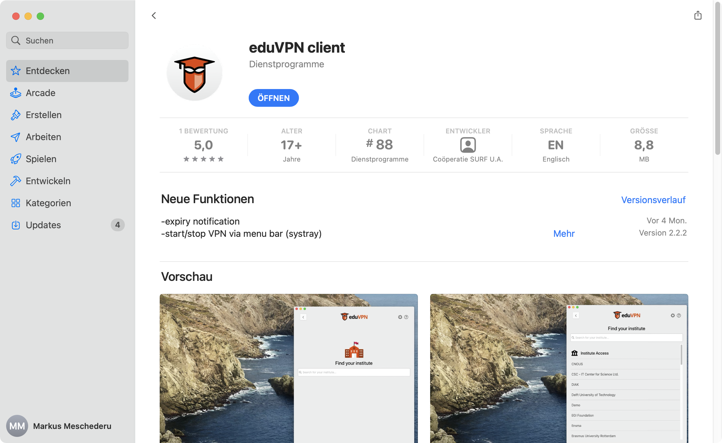 Von der Downloadseite bei eduVPN https://www.eduvpn.org/client-apps/gelangen Sie direkt  zum App Store. Dort können Sie den eduVPN-Client installieren: