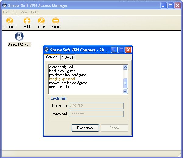 Zum Verbindungsaufbau klicken Sie dann einfach auf den Namen Shrew-LRZ.vpn bzw. das Schlosssymbol, dann auf Connect. Es wird nun die Nutzerkennung und das Passwort abgefragt. Bei Erfolg sollte es wie im folgenden Bild aussehen.