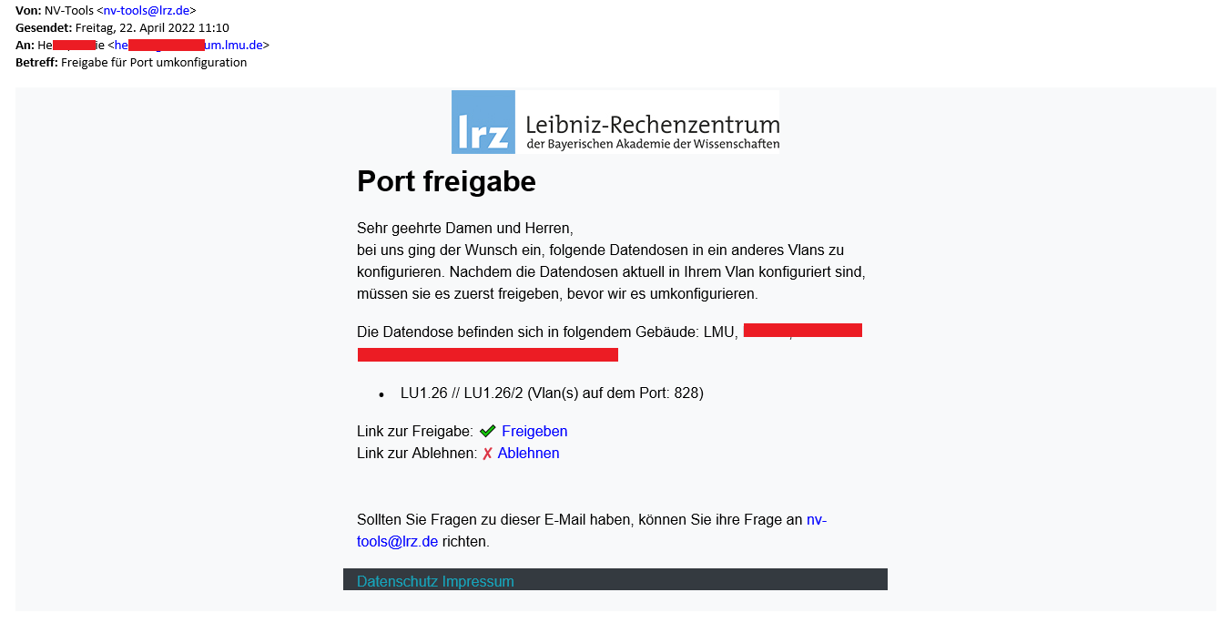 Sie erhalten diese E-Mail, weil eine andere Person einen Port umkonfiguriert haben möchte, auf dem Ihr Vlan konfiguriert ist. |
