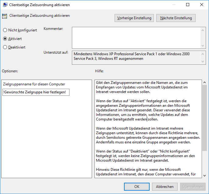 In der Richtlinie "Clientseitige Zielzuordnung" hinterlegen Sie die entsprechende Zielgruppe. Verwenden Sie den entsprechenden Zielgruppennamen, um die standardmäßigen Einstellungen der LRZ-WSUS-Patch-Verteilung zu verwenden.